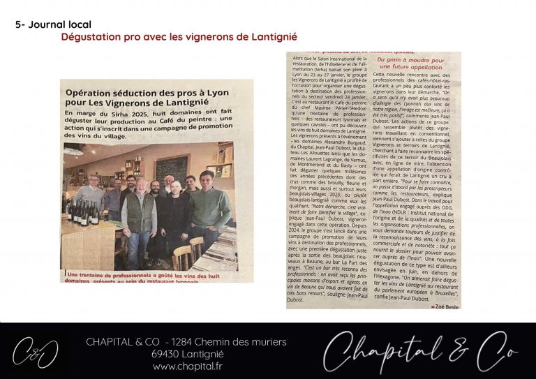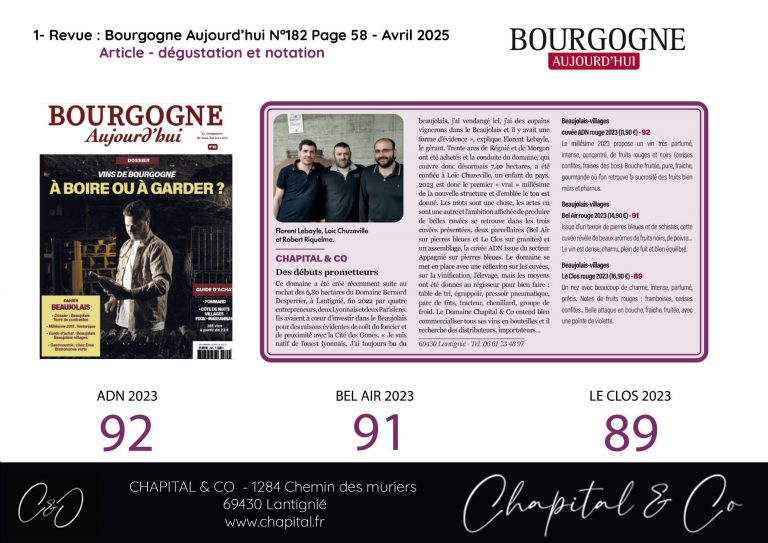 Des débuts remarqués pour Chapital & Co dans le Beaujolais 16 mai 2025 Notre aventure dans le Beaujolais suscite l’attention : Bourgogne Aujourd’hui salue nos « débuts prometteurs » dans son numéro d’avril